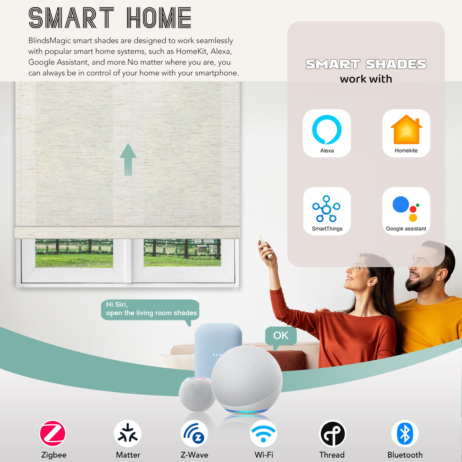 BlindsMagic smart shades are designed to work seamlessly with popular smart home systems, such as HomeKit, Amazon Alexa, Google Assistant, and more.