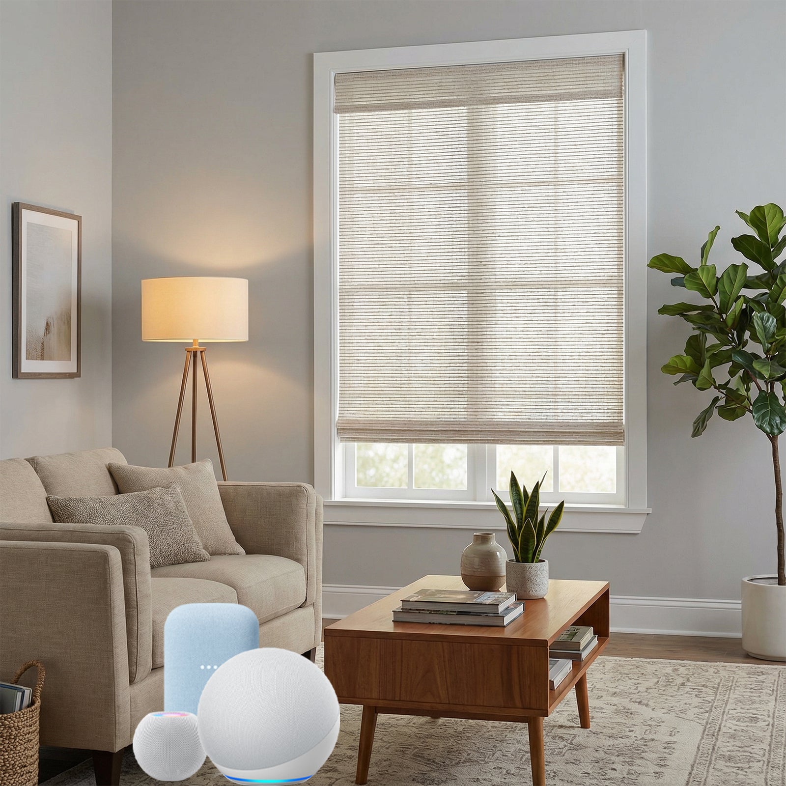 Enjoy hands-free control of your shades throughout your home. Simply say “Hey Google/ Alexa/ Siri...” to open, close, or adjust your shades to the perfect level, making your home more comfortable and convenient.