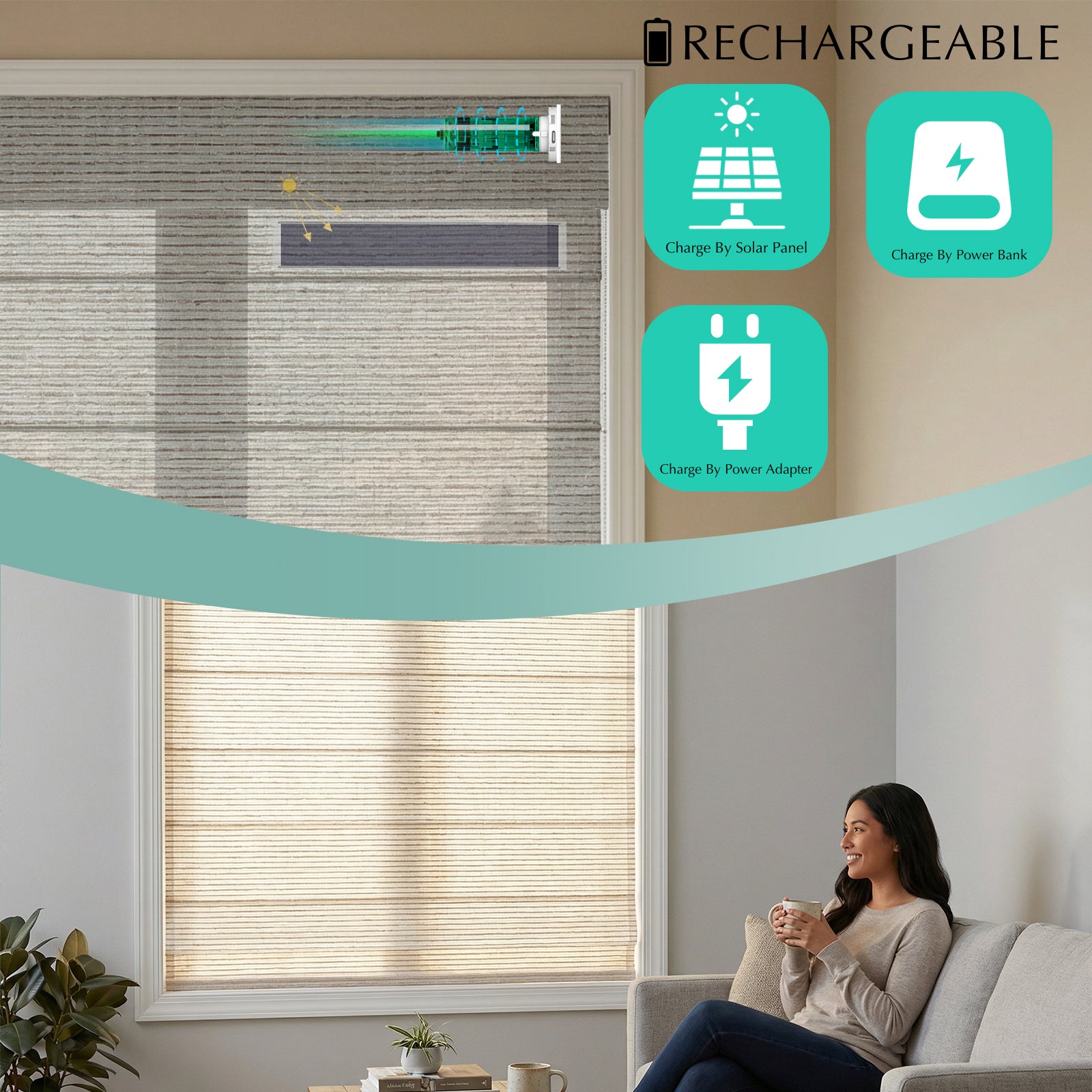 Our blinds have a built-in rechargeable battery, which means there are no cords or external power sources needed. A single charge can power the blinds for up to 600 cycles, or around 6 months, depending on how often they are used. For an even more sustainable power source, you can add a solar panel charging kit. Our cutting-edge technology will elevate your home while aligning with your values.