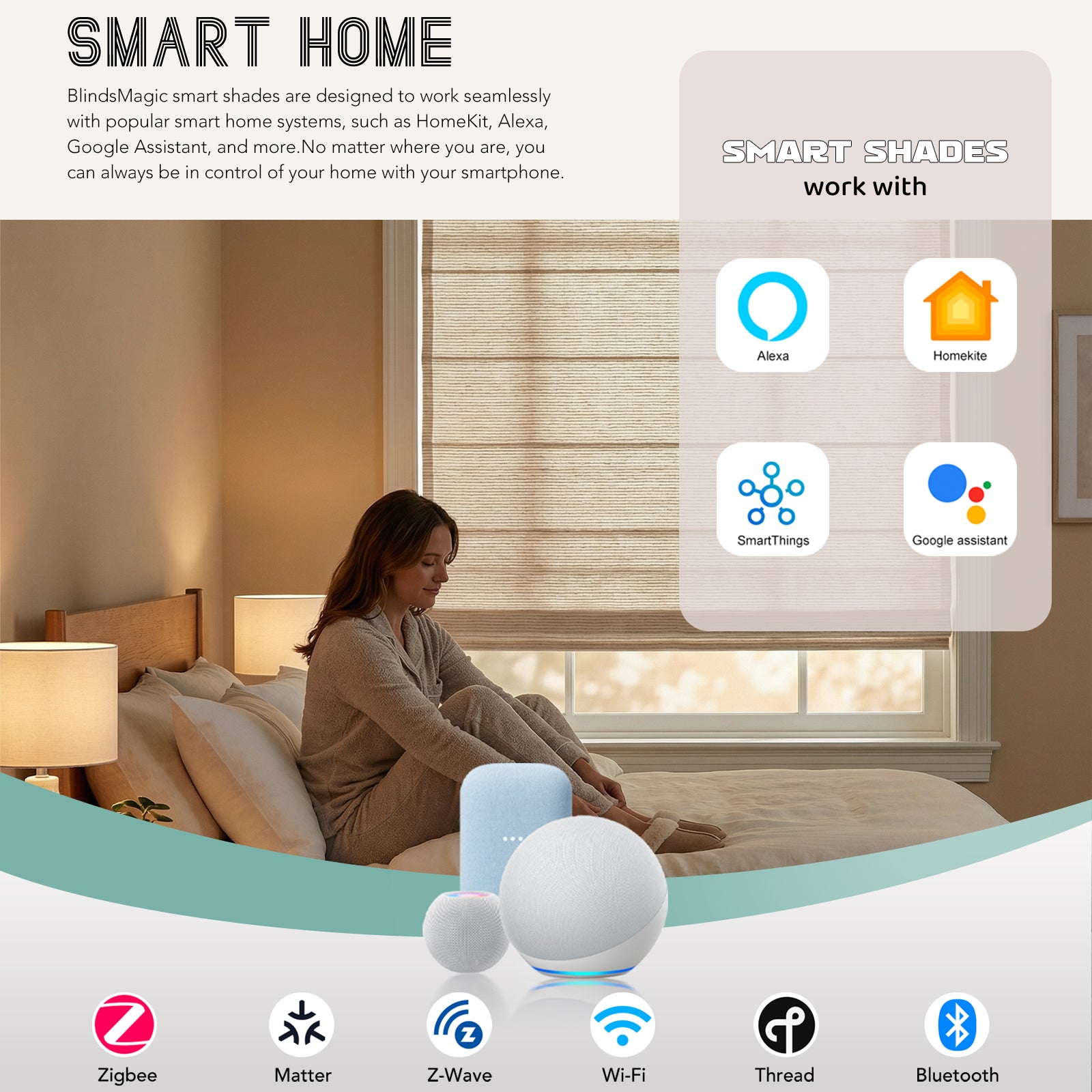 BlindsMagic smart shades are designed to work seamlessly with popular smart home systems, such as HomeKit, Amazon Alexa, Google Assistant, and more.