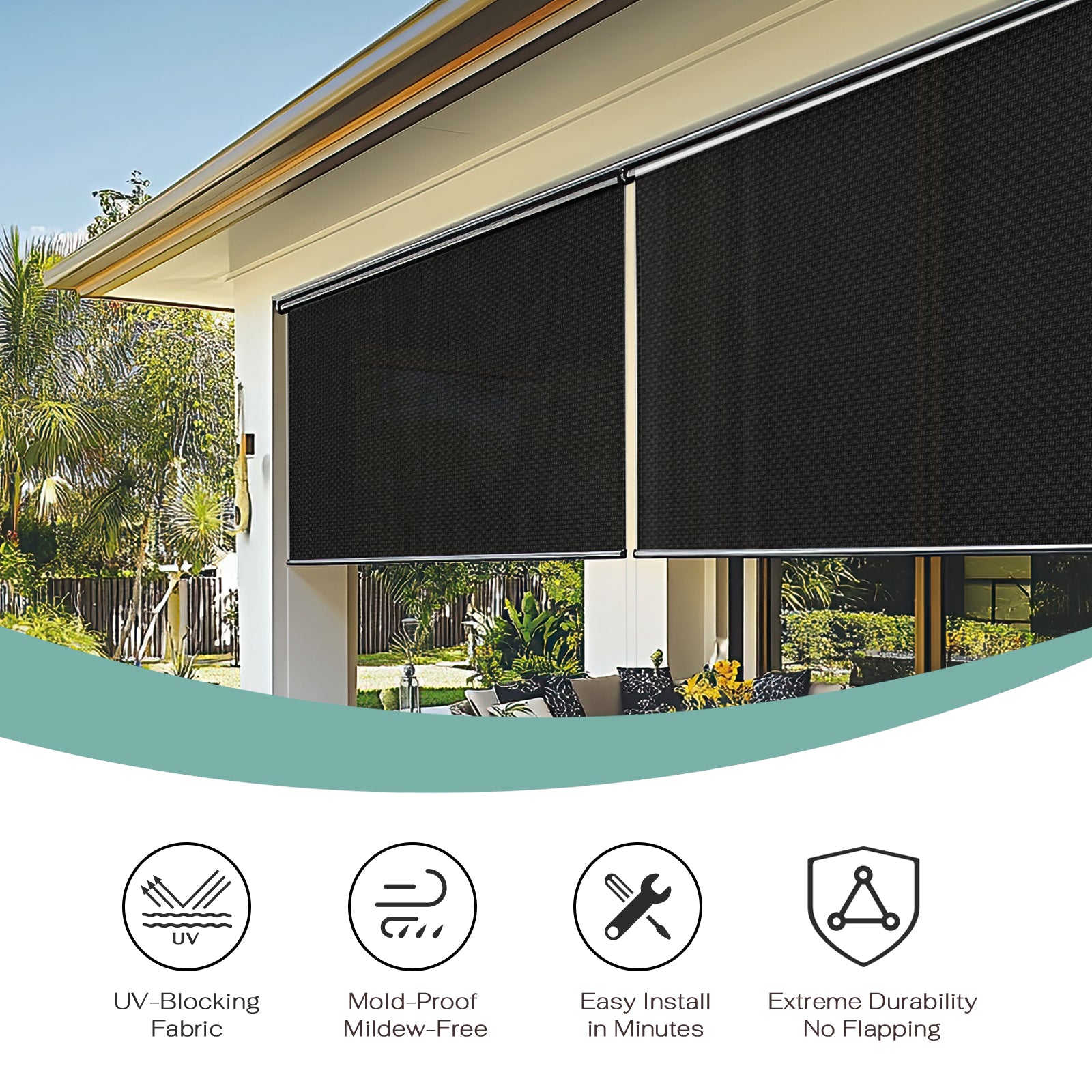 Ultra-durable outdoor shades built to last. Featuring reinforced steel construction and weatherproof, mold-resistant fabric that won't sag or deteriorate. Provides reliable protection season after season while staying fresh and looking new. Quick and easy to install.