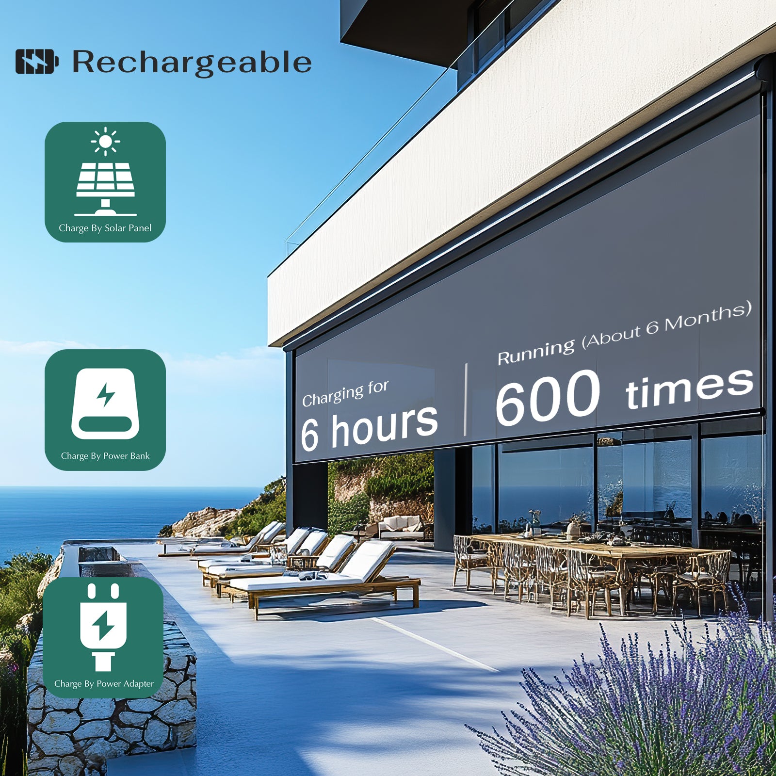 Our blinds have a built-in rechargeable battery, which means there are no cords or external power sources needed. A single charge can power the blinds for up to 600 cycles, or around 6 months, depending on how often they are used. For an even more sustainable power source, you can add a solar panel charging kit. Our cutting-edge technology will elevate your home while aligning with your values.